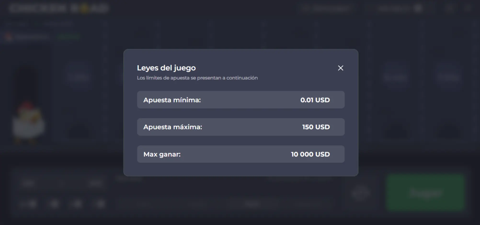 El juego también cuenta con un rango de apuestas bastante amplio, ya que permitimos apuestas desde $0.01 hasta $150 en cualquiera de los niveles de dificultad del juego de apuestas Chicken Road.